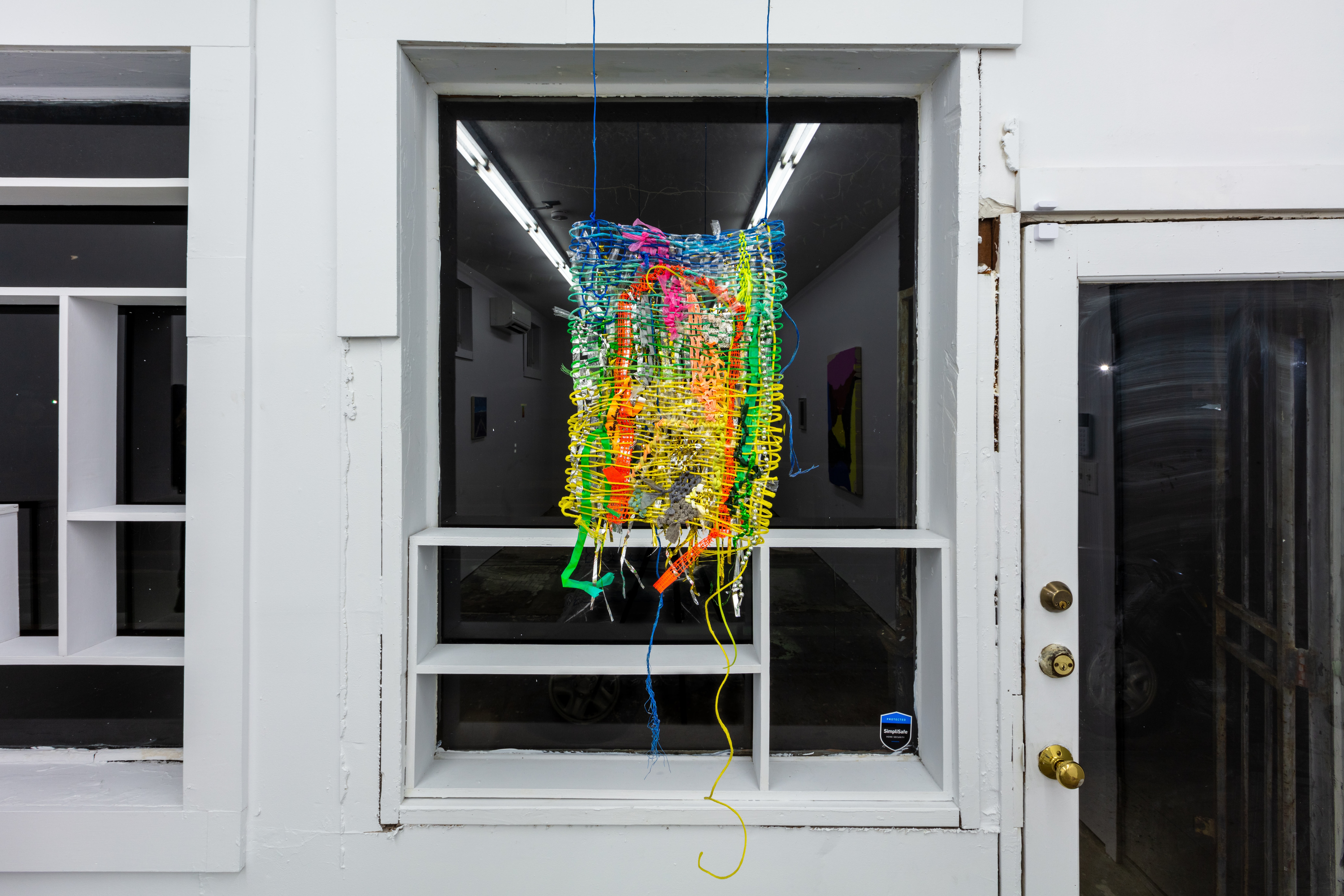 Ian Gerson fetes the nightclub as a haven for queer joy in their tender drawings of dance floors and disco balls. Their woven tapestries are constructed from objects found in Galveston Bay and the Houston Ship Channel along with once-treasured totems now discarded and repurposed. The disco ball tapestry in the window gleams like a beacon and suggests safe harbor.